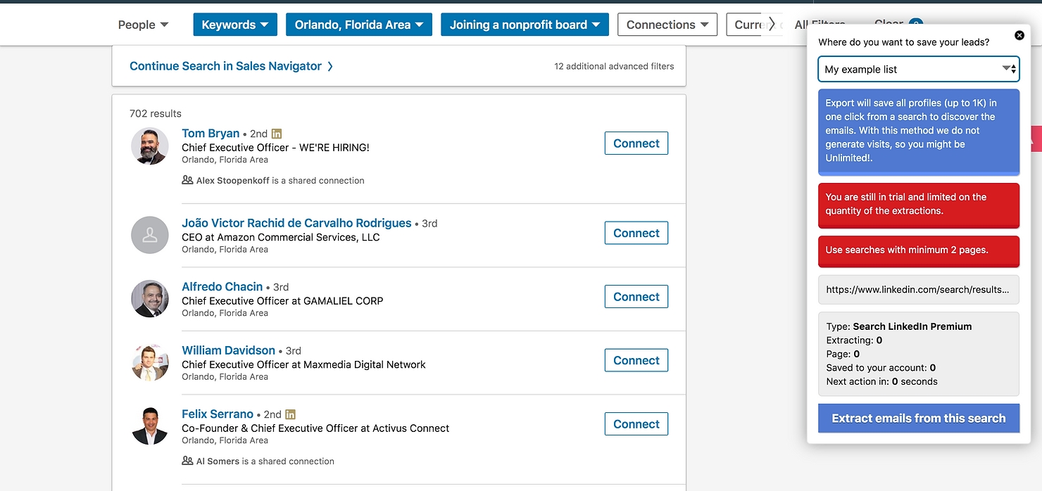 Social media is a powerful search tool for finding people who are interested in your cause. This method lets you turn a search on a free account or a premium account into the names, companies, titles, emails, social profiles, locations and more in one-click.
